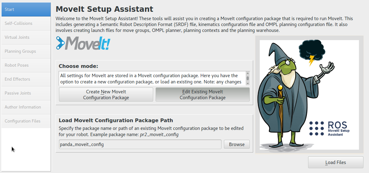 This will bring up the start screen with two choices: Create New MoveIt! Configuration Package or Edit Existing MoveIt! Configuration Package.