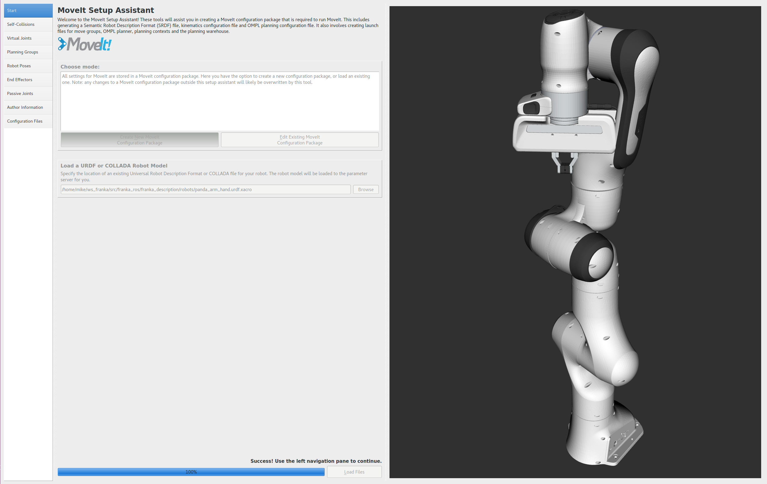 - Click on the browse button and navigate to the panda_arm_hand.urdf.xacro file installed when you installed the Franka package above. (This file gets installed in /opt/ros/kinetic/share/franka_description/robots/panda_arm_hand.urdf.xacro on Ubuntu with ROS Kinetic.) Choose that file and then click Load Files. The Setup Assistant will load the files (this might take a few seconds) and present you with this screen: