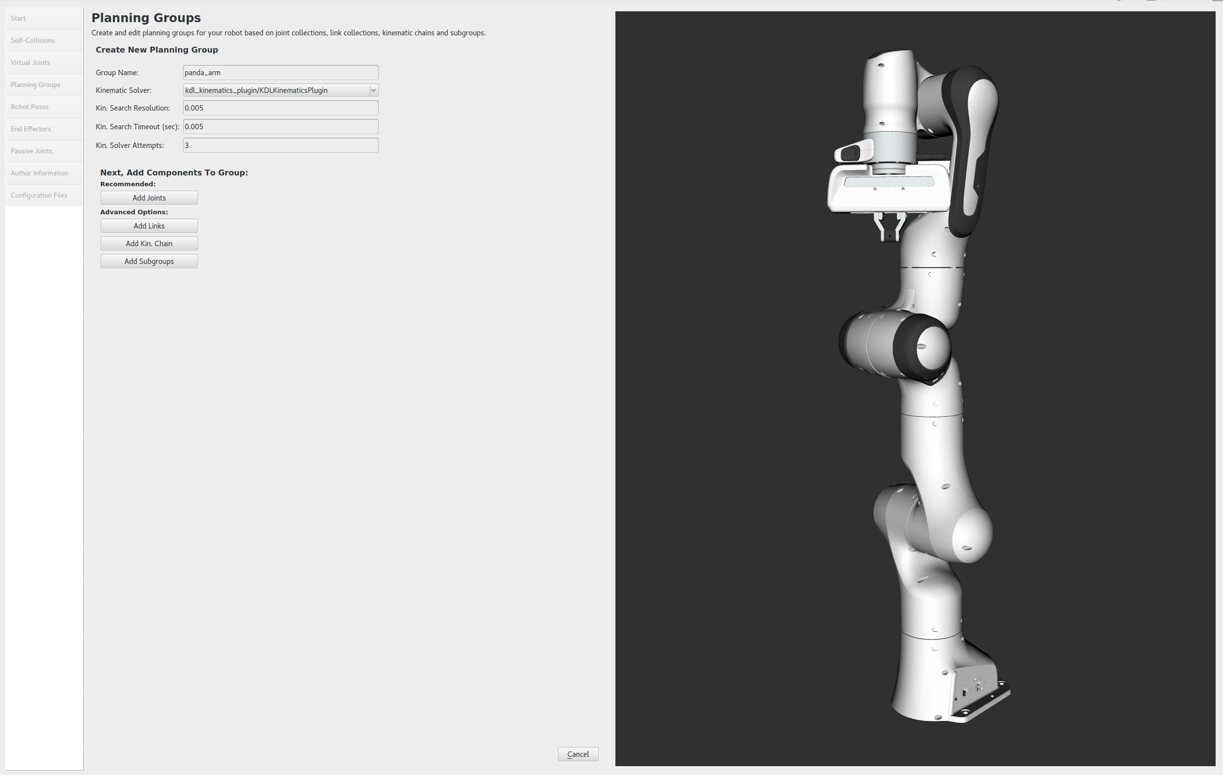 - Choose panda_hand, panda_leftfinger, and panda_rightfinger and add them to the list of Selected Links on the right hand side.