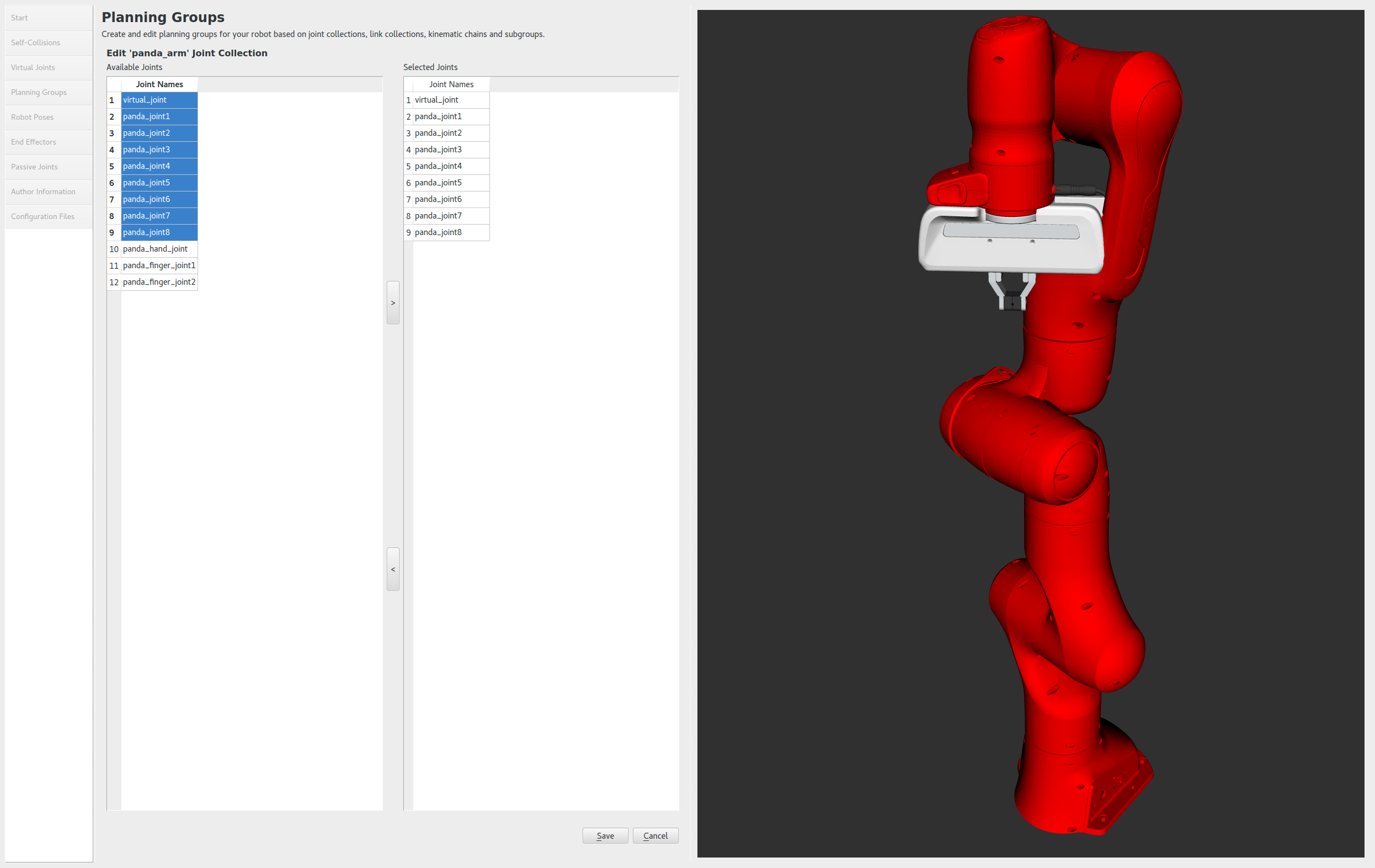 - Click on virtual_joint, hold down the Shift button on your keyboard and then click on the panda_joint8. Now click on the > button to add these joints into the list of selected joints on the right.