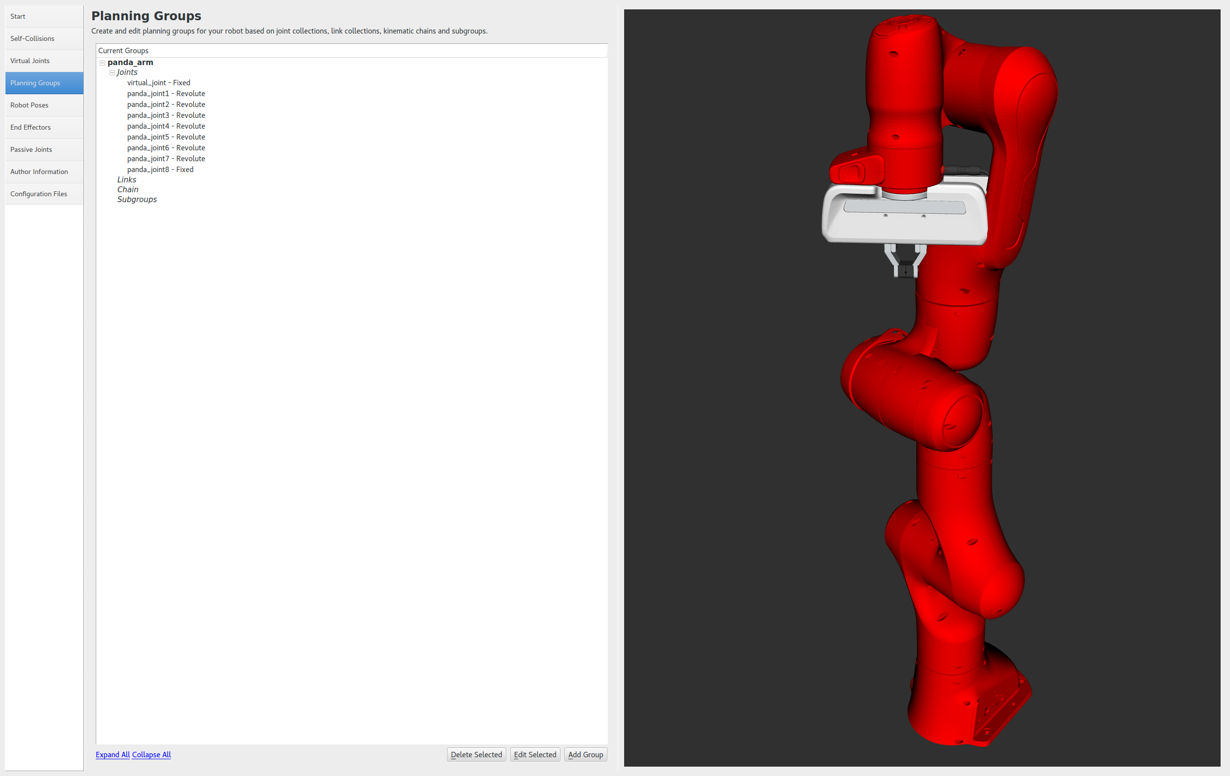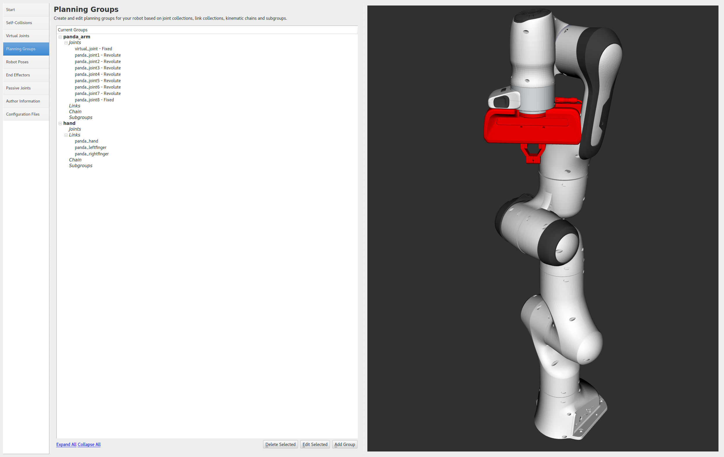 We have already added the gripper of the Panda. Now, we will designate this group as a special group: end effectors. Designating this group as end effectors allows some special operations to happen on them internally.