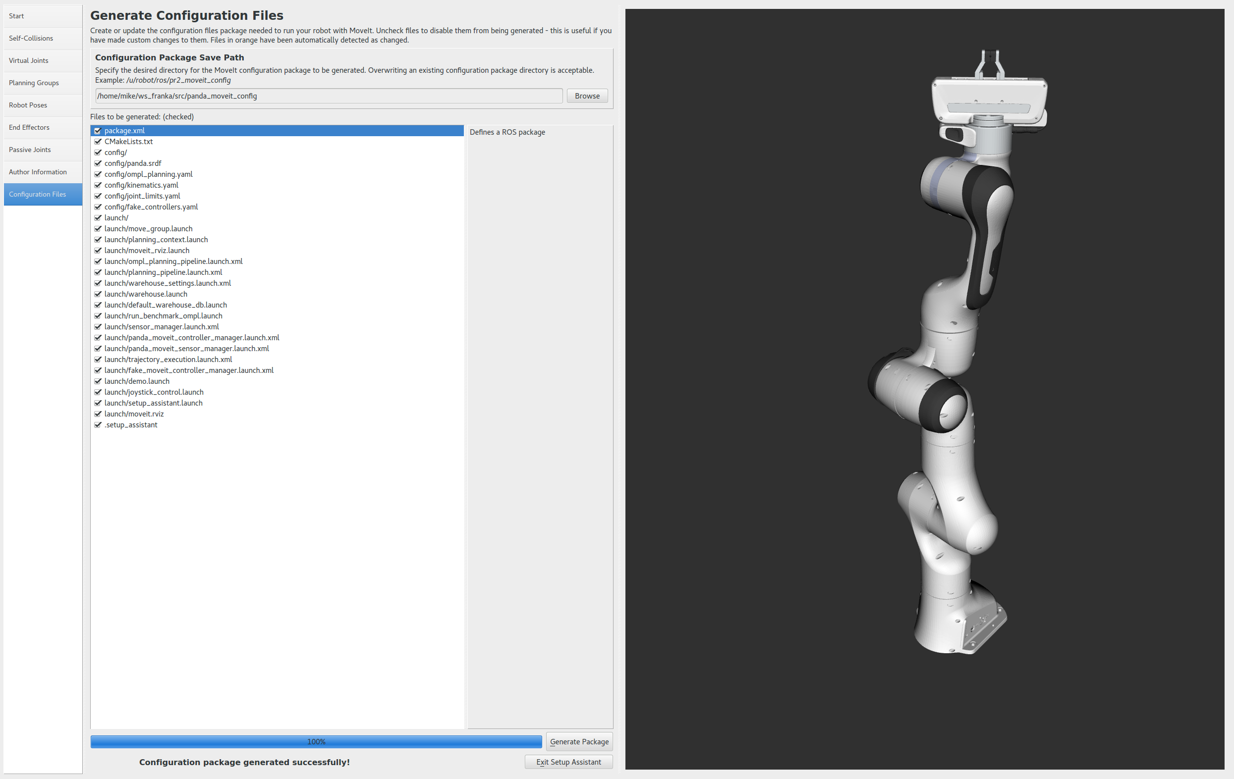 - Click on the Configuration Files pane. Choose a location and name for the ROS package that will be generated containing your new set of configuration files. Click browse, select a good location (for example, your home directory), click Create New Folder, call it “panda_moveit_config”, and click Choose. “panda_moveit_config” is the location used in the rest of the documentation on this wiki. This package does not have to be within your ROS package path. All generated files will go directly into the directory you have chosen.