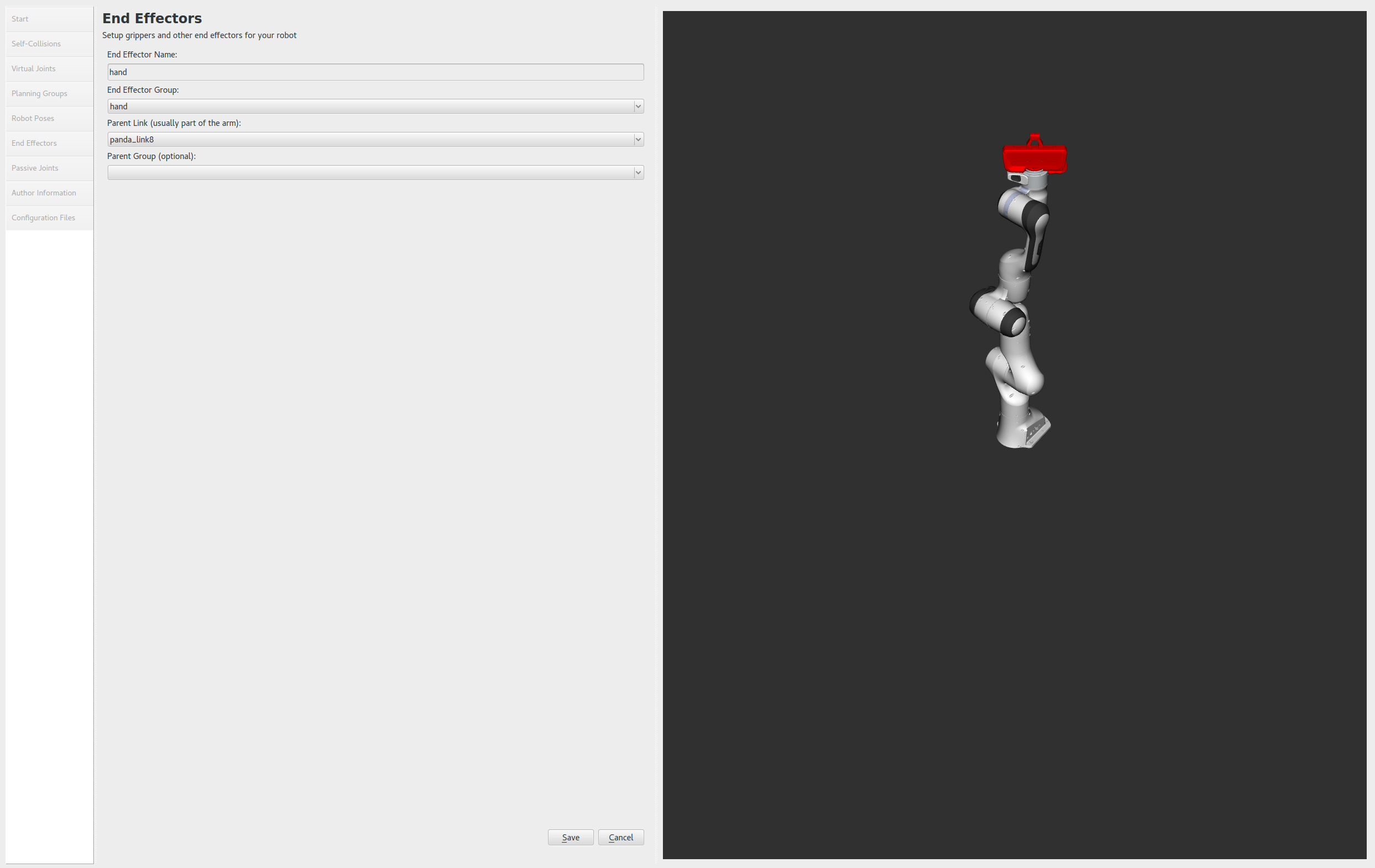 - Select panda_link8 as the Parent Link for this end-effector.