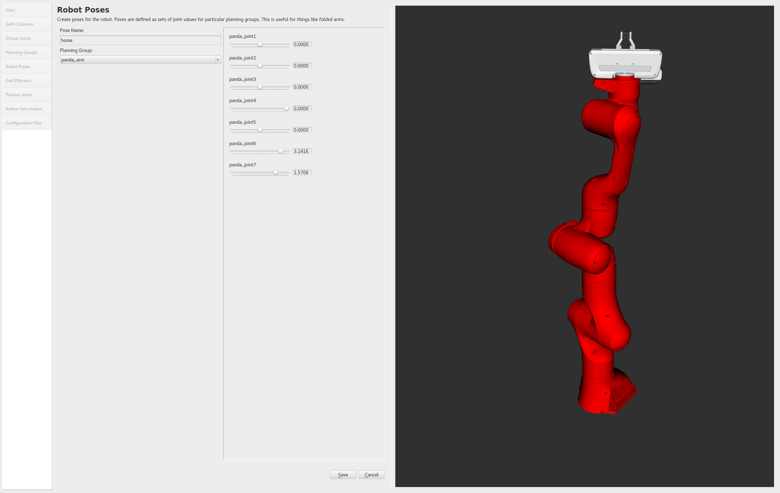 The Setup Assistant allows you to add certain fixed poses into the configuration. This helps if, for example, you want to define a certain position of the robot as a Home position.