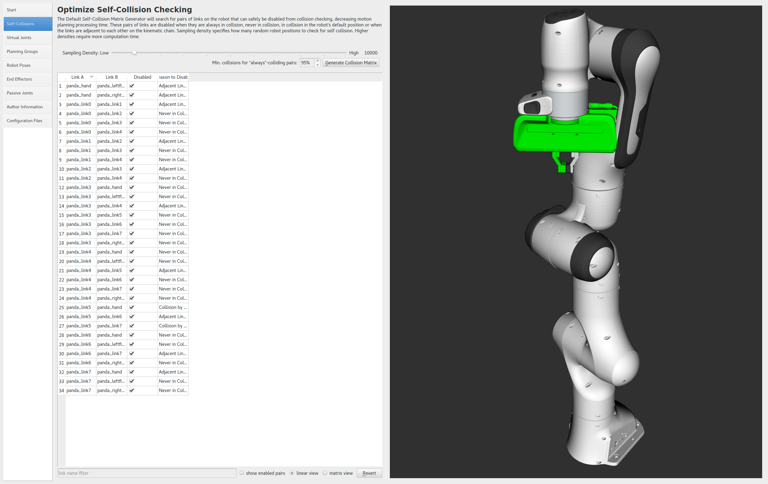- Click on the Self-Collisions pane selector on the left-hand side and click on the Generate Collision Matrix button. The Setup Assistant will work for a few second before presenting you the results of its computation in the main table.